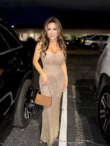 Petra elbiseyle yıldız gibi parlayın. Yumuşak streç ağdan üretilmiş, tüm yüzeyi yapay elmaslarla süslenmiş, ışıltılı ve parlak bir maksi elbise. Seksi, yarı şeffaf görünümüyle elbise, kare yakalı ve sırt dekolteli bir tasarımla tamamlanıyor.